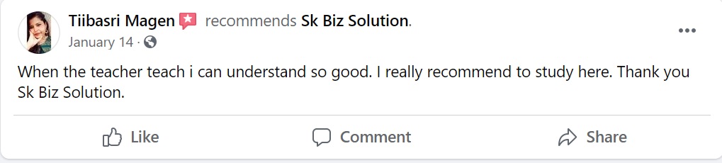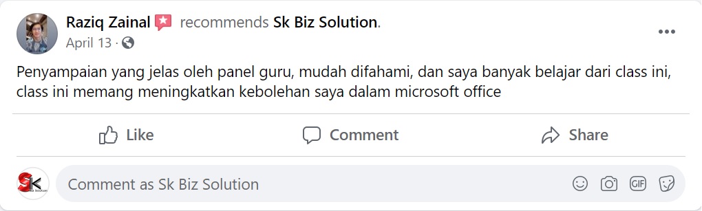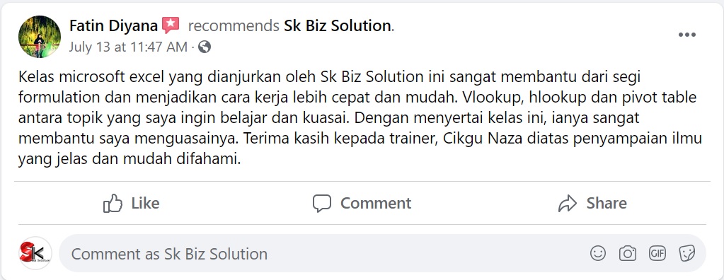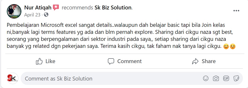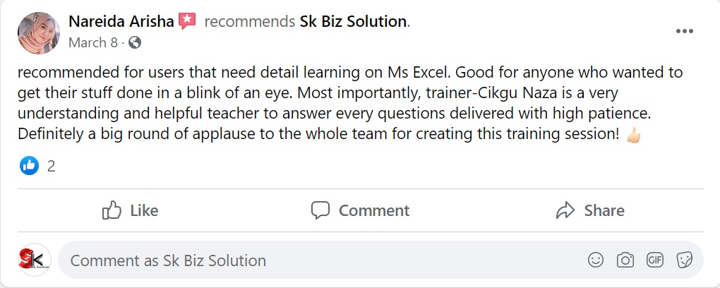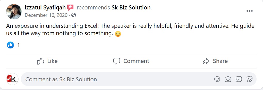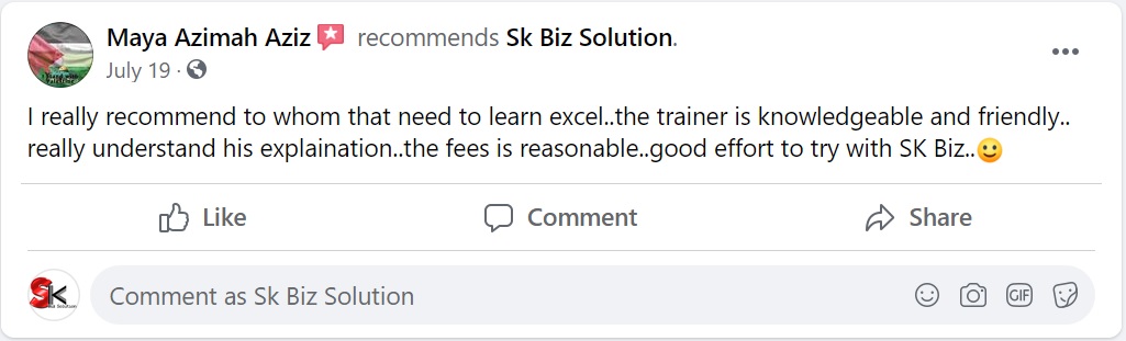 Trainer will guide the participants how to use Excel correctly step by step, from foundational to advanced level. He will show you the example and case study so you can understand easily. The delivery also is easy to understand.